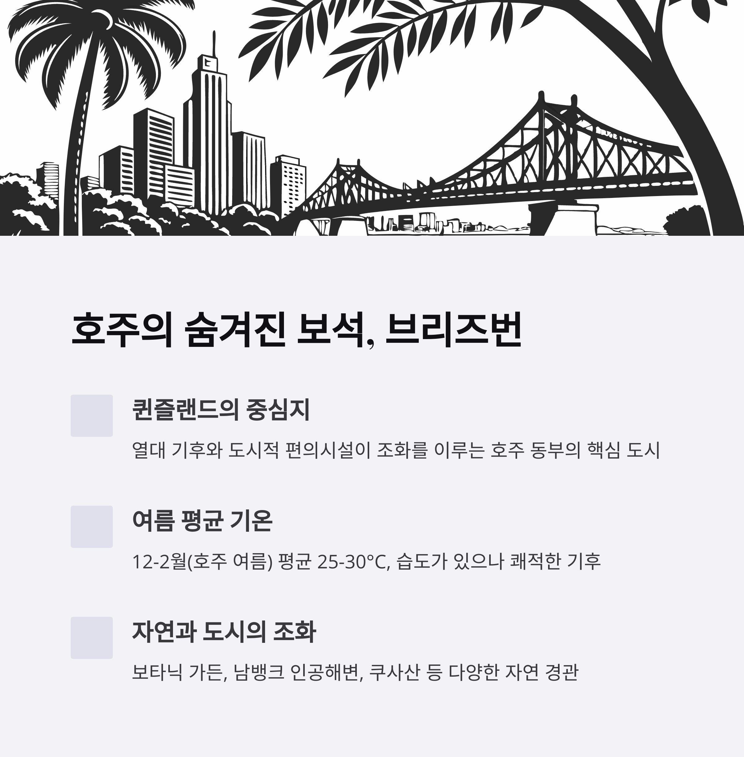 브리즈번은 호주 퀸즐랜드 주의 중심도시로, 온화하고 쾌적한 날씨를 자랑합니다