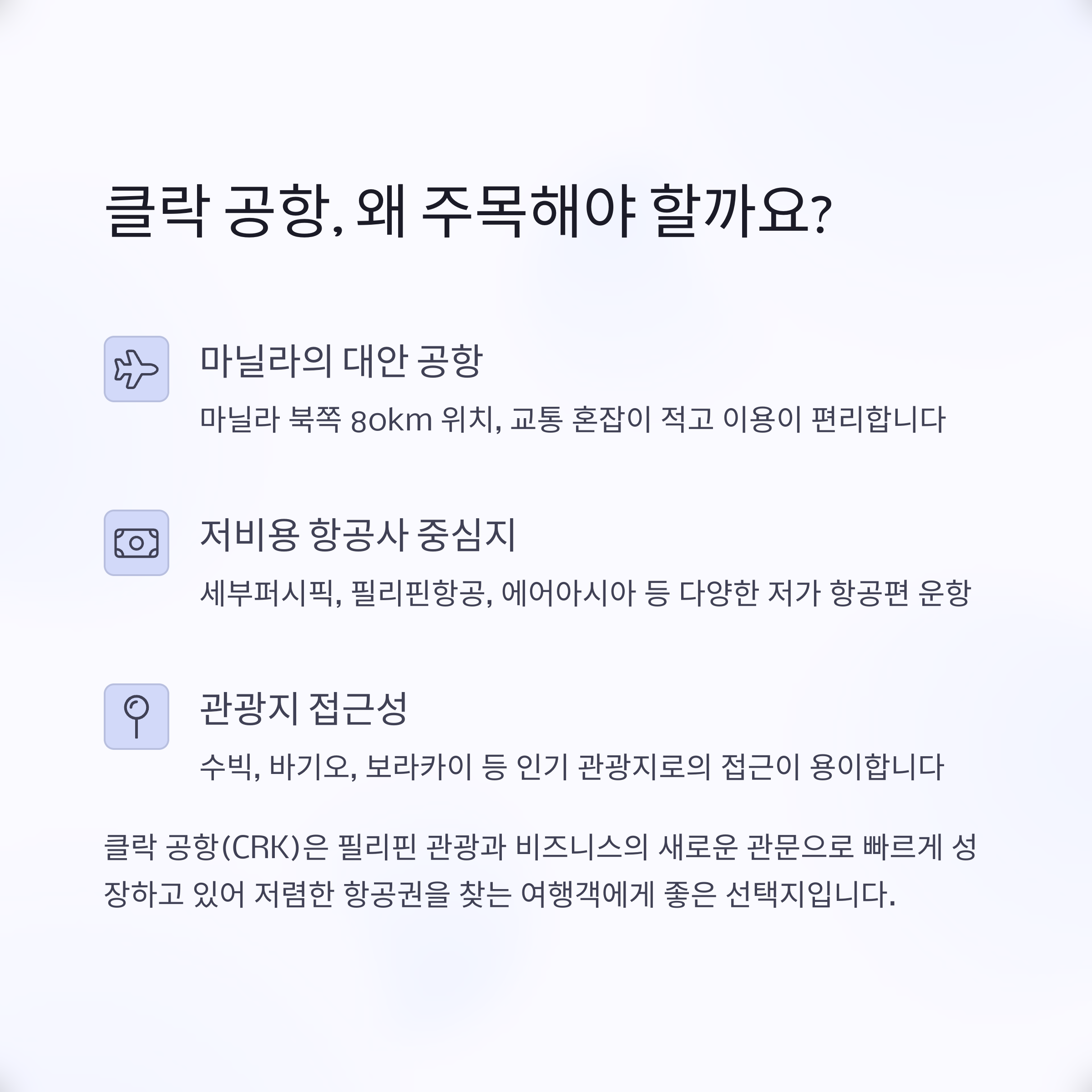"마닐라보다 한적하고 빠른 입출국이 가능한" 장점이 있습니다